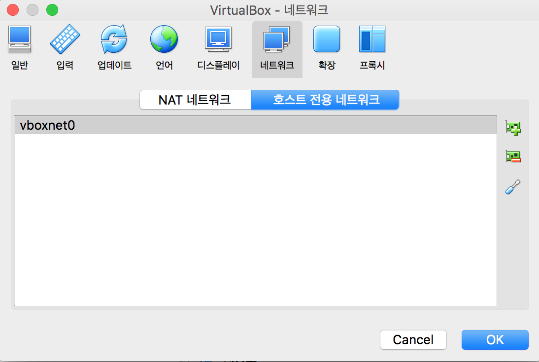 우측의 추가 버튼을 클릭한다. 그러면, vboxnet0이 추가되고, 다시 이전의 vm 인스턴스 설정 화면에서 네트워크 설정을 변경하면, 이제 호스트 전용 네트워크 (어댑터2)를 선택하더라도 잘못된 설정이라고 뜨지 않는다.