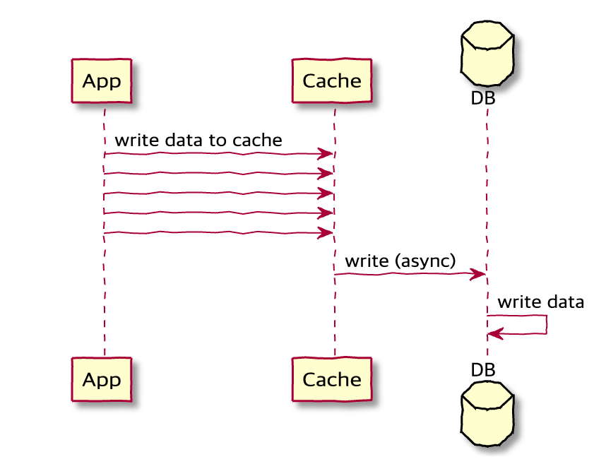쓰기 요청은 캐시까지만이다. 캐시에 데이터가 갱신되면 쓰기 요청은 완료된다. 그리고, 별도의 서비스 등을 통해 캐시의 내용이 나중에 데이터베이스로 동기화 된다. 캐시의 flush 정책(LRU, FIFO, LIFO 등)에 따라 데이터가 데이터베이스로 저장된다. 쓰기 요청이 많은 경우에 적합하다. 캐시의 내용을 데이터베이스에 몰아서 수행하므로, 쓰기 비용을 절약할 수 있다. 바꿔 말하면, 데이터를 모아뒀다가 한번에 기록하므로 그 사이에 장애가 발생하면 데이터의 유실이 발생한다.