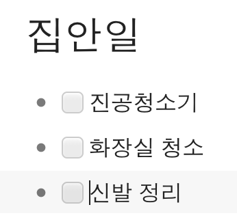 리스트를 작성한 후, 아이템에 커서를 올리면 왼쪽 편에 뜨는 메뉴를 클릭할 수 있다. 그 메뉴에서 체크박스를 추가한다고 클릭하면 해당 아이템은 체크박스형 아이템으로 바뀐다.
