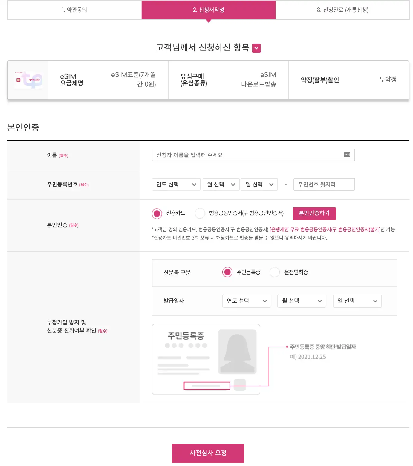 이름, 주민번호 등을 입력합니다. 앞서 사전 준비한 신용카드 및 신분증 정보를 입력합니다.
