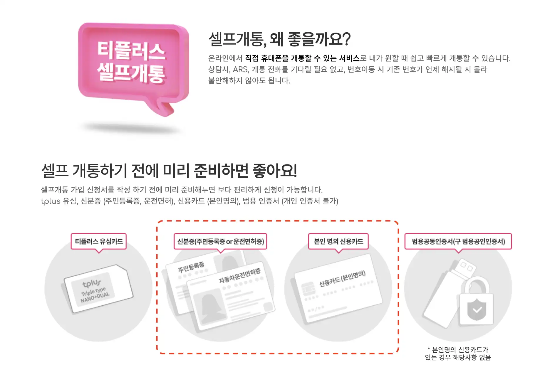 상단 배너 메뉴 중, 셀프개통 메뉴를 클릭하여 개통해 봅시다.