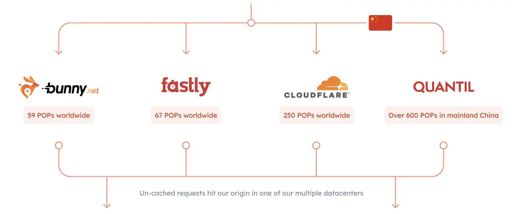클라우드 플레어 CDN, Fastly 등과 같은 여러 CDN 서비스를 동시에 후단에 둠으로써, 서비스 가용성을 보장한다. 즉, 한 CDN 업체의 서비스에 문제가 발생하면 다른 CDN 업체의 캐시를 활용하여 지속적인 서비스를 제공하게 된다.
