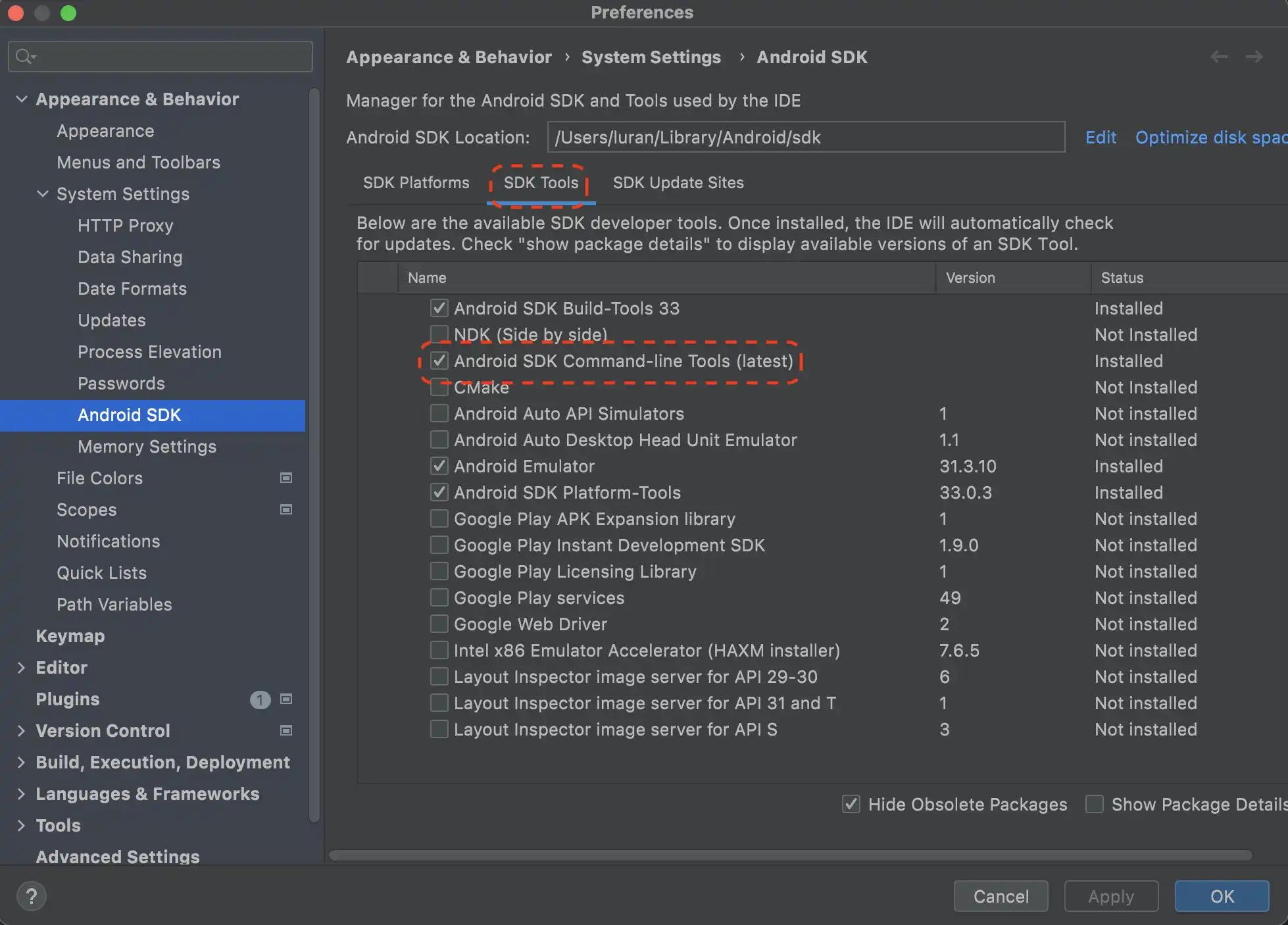 cmdline-tools를 설치해 줘야 하는데, 가장 직관적이고 쉬운 방법은 GUI에서 문제를 해결하는 것이다.